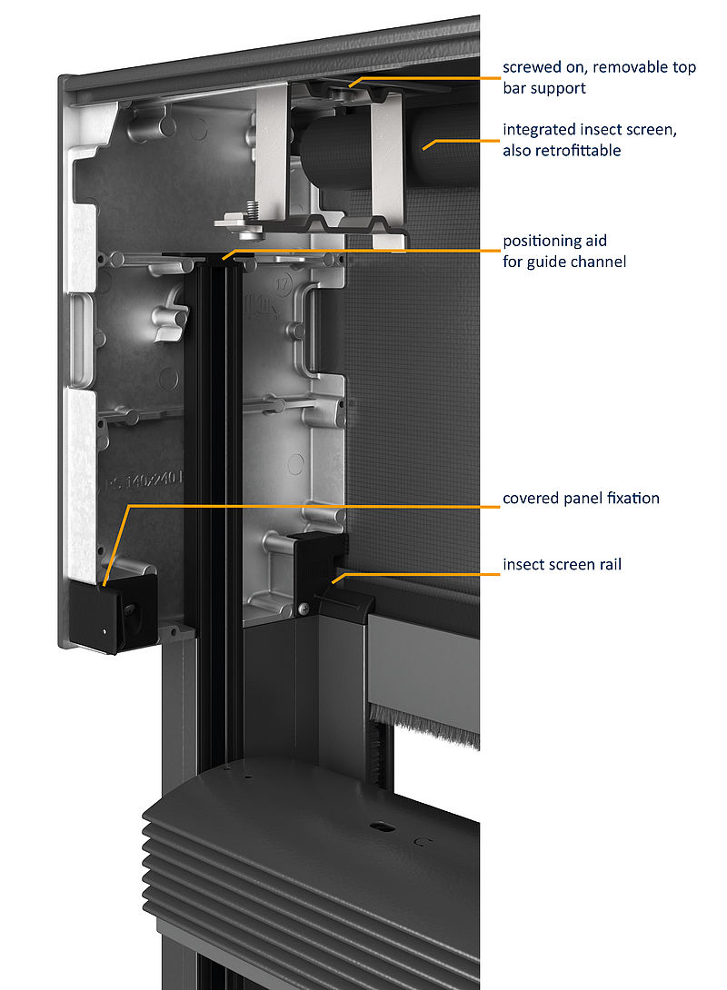 All three box sizes can also be equipped with integrated insect protection. This is placed on a spring shaft in the box behind the plate stack and is immediately ready for use if required. During the winter months, the insect protection roller blind is kept out of sight and protected in the box.